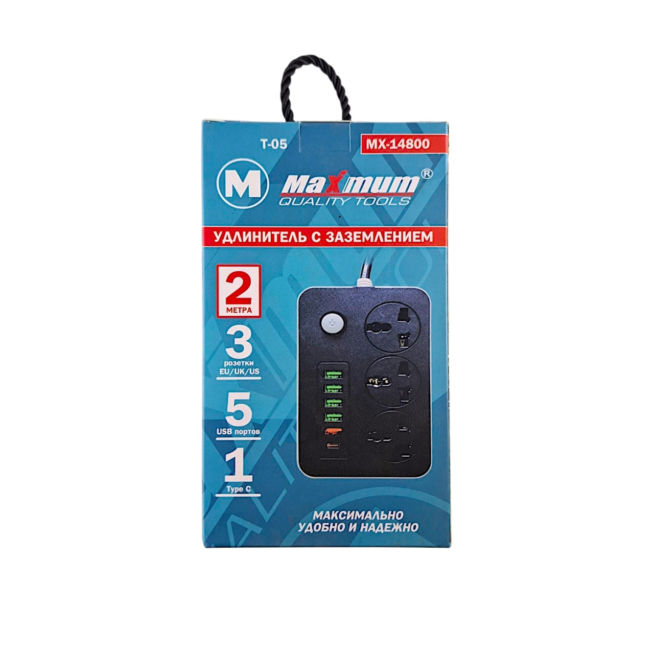 Удлинитель с заземлением 2 м, плоский, 3 розетки EU_UK_US, 5 USB портов,Type C,T05, "MAXIMUM" MX 148