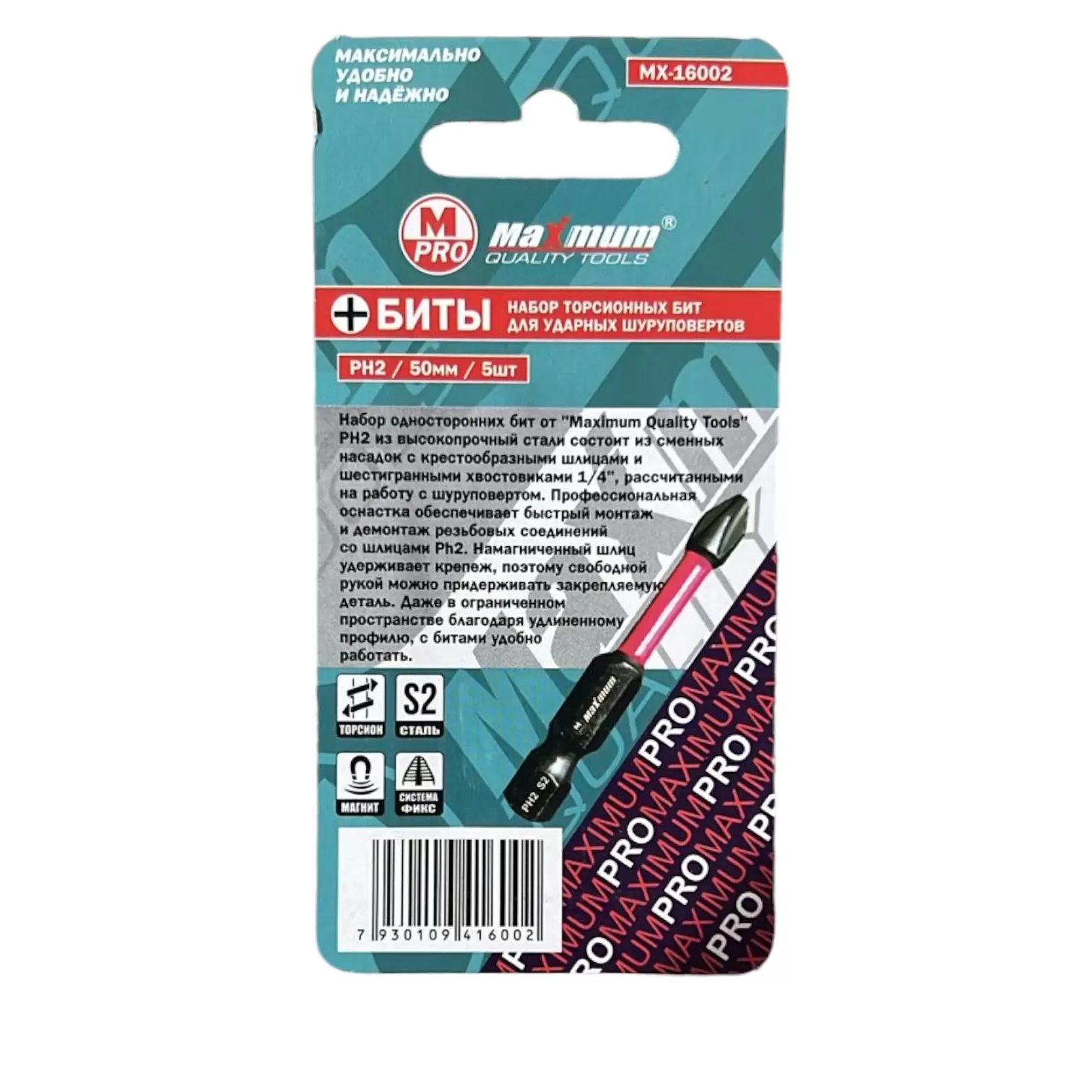 Набор бит торсионных для ударных шуруповертов PH2, 50 мм, S2, 5шт., "MAXIMUM" MX 16002